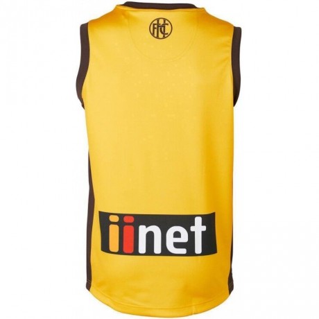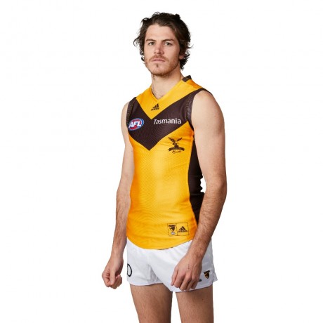 Authentic Hawthorn Hawks 2019 Legends Guernsey reflects vintage design with a gold and brown chevron and re-digitised club logos.