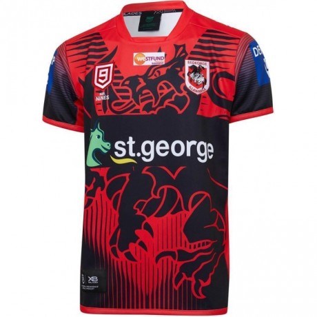 Embroidered and sublimated team and sponsor logos showcase official St. George Illawarra Dragons branding.