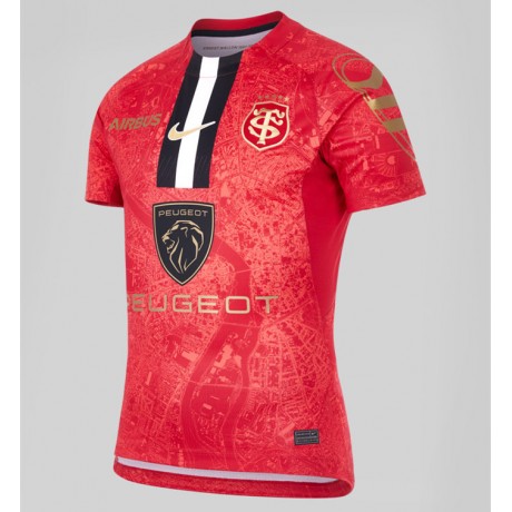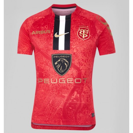 Bold red with embroidered logos: Nike Swoosh and Stade Toulousain crest prominently stitched at heart level for club authenticity.